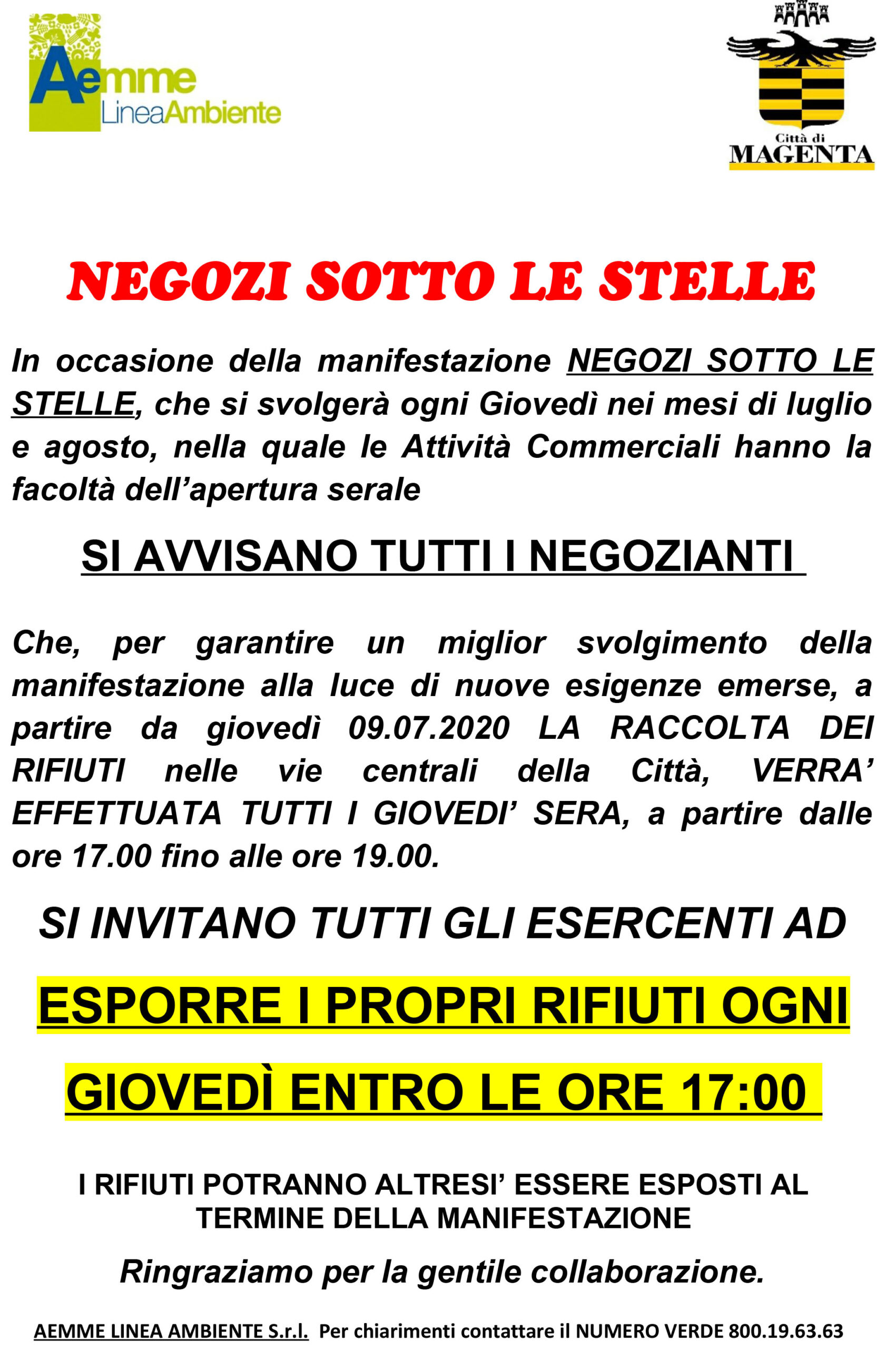 Si avvisano i negozianti che in occasione della manifestazione ‘Negozi sotto le stelle’, prevista tutti i giovedì sera di luglio e agosto, a partire da giovedì 9 luglio la raccolta dei rifiuti nelle vie centrali della città verrà effettuata dalle ore 17 alle ore 19. Pertanto si invitano gli esercenti a esporre i rifiuti entro le 17 oppure al termine della manifestazione.