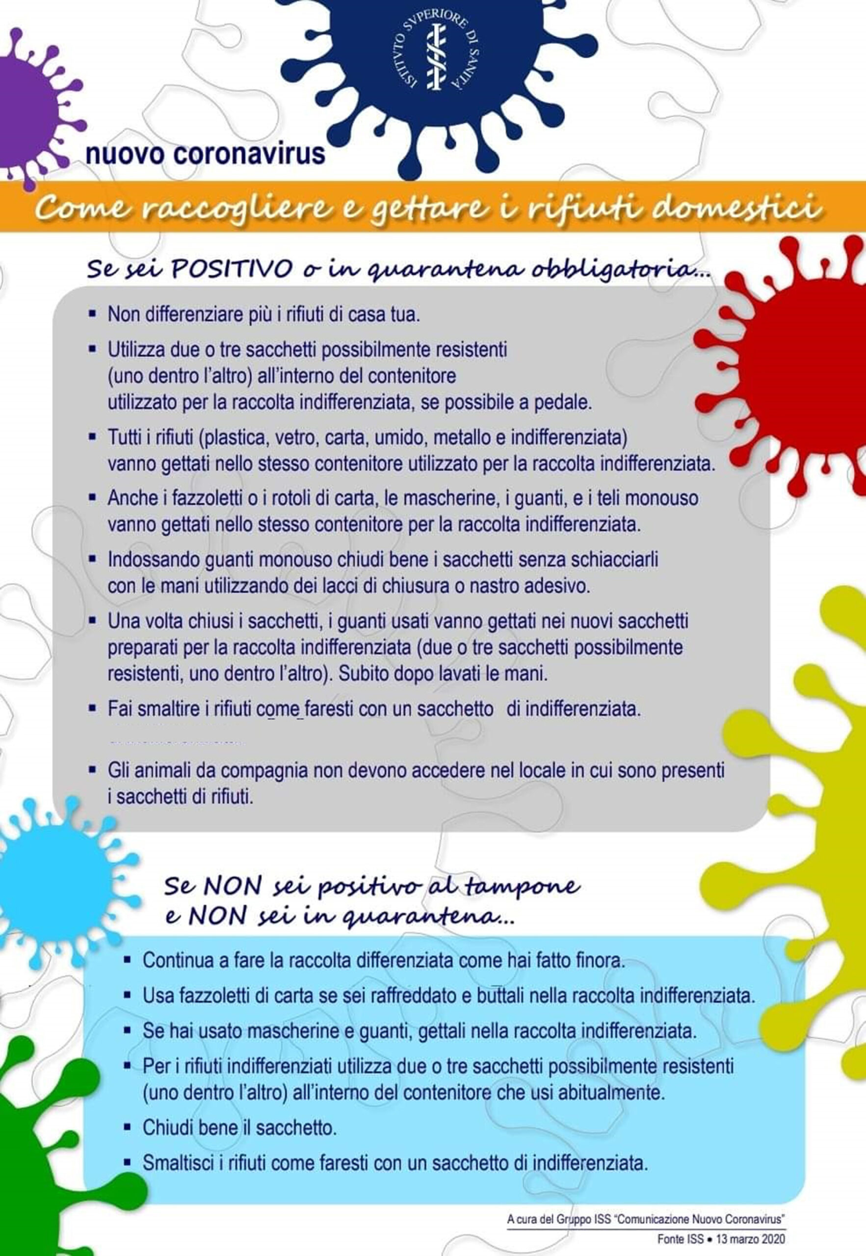L’Istituto Superiore di Sanità ha stilato alcune regole da seguire nella gestione dei rifiuti per chi è risultato positivo al nuovo coronavirus e per chi si trova in quarantena obbligatoria. In allegato la locandina con tutte le istruzioni.