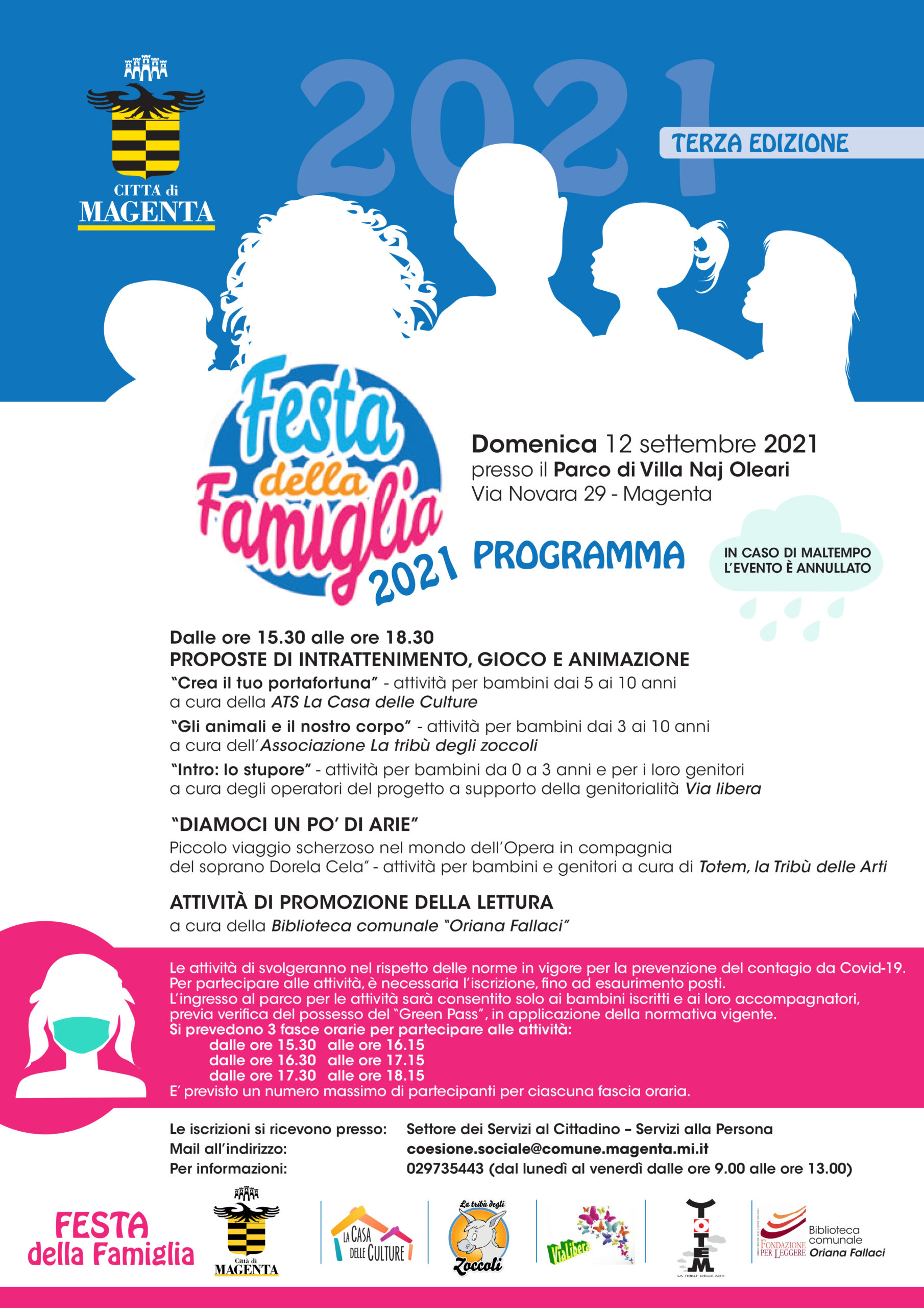 Domenica 12 settembre al Parco di Villa Naj Oleari, in via Novara 29 a Magenta, si terrà la terza edizione della Festa della Famiglia. Un primo passo verso la ripresa delle attività dedicate alle famiglie dopo il difficile periodo provocato dall’emergenza Coivd-19. Tante le proposte realizzate in collaborazione con la Biblioteca comunale Oriana Fallaci e le associazioni La Casa delle Culture, La tribù degli Zoccoli, ViaLibera e Totem la Tribù delle arti.