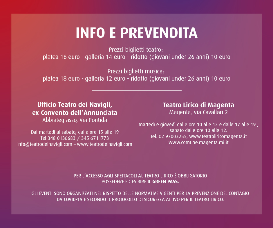 Teatro Lirico di Magenta, via Cavallari 2 – martedì e giovedì dalle ore 10 alle 12 e dalle 17 alle 19 , sabato dalle ore 10 alle 12. Tel. 02 97003255, www.teatroliricomagenta.it – www.comune.magenta.mi.it