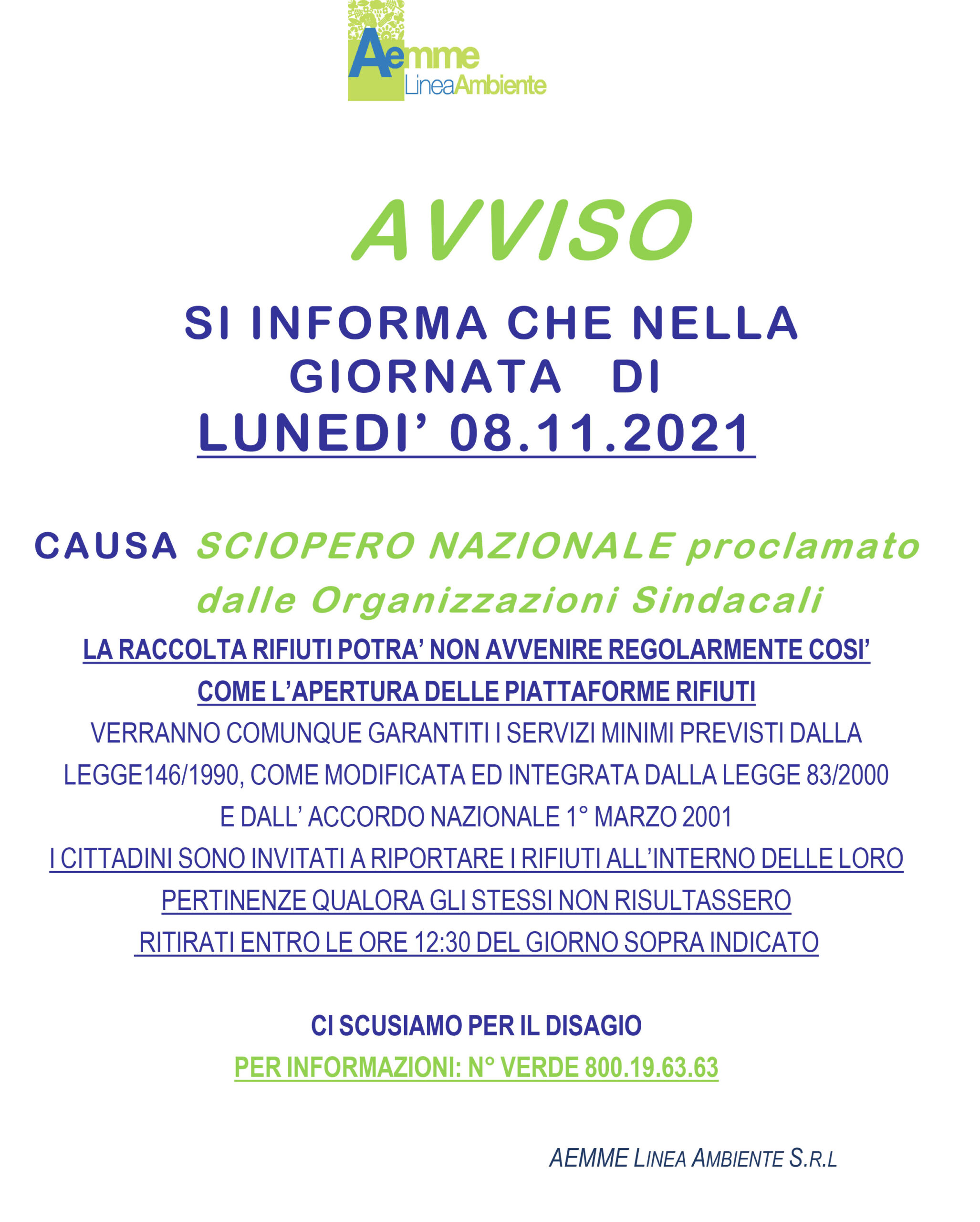 ambientale, nella giornata di lunedì 8 novembre AEMME Linea Ambiente non potrà garantire il regolare svolgimento dei servizi di raccolta rifiuti e apertura della piattaforma ecologica, saranno garantiti i servizi minimi previsti per legge. Qualora entro le ore 12:30 di lunedì 8 novembre gli operatori non avessero provveduto ad effettuare il ritiro dei rifiuti, AEMME Linea Ambiente invita i cittadini a riportarli all’interno delle proprie pertinenze.