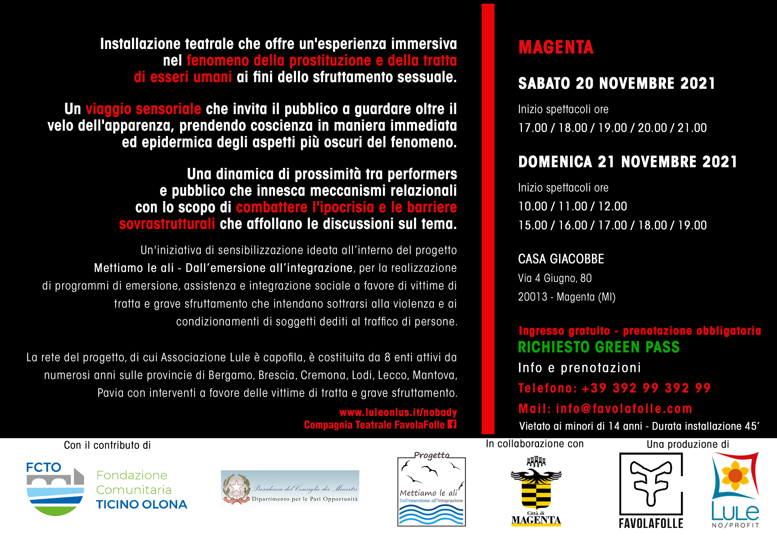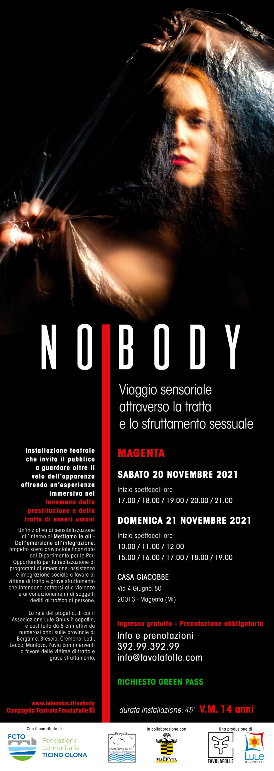 “NoBody” è un’installazione teatrale realizzata dalla Compagnia Teatrale FavolaFolle, in collaborazione con l’Associazione Lule Onlus e con il Comune di Magenta, sul fenomeno della tratta e dello sfruttamento sessuale, che si terrà sabato 20 novembre 2021 dalle ore 17 alle ore 21 e domenica 21 novembre 2021 dalle ore 10 alle ore 19, presso Casa Giacobbe in via IV Giugno, 80 a Magenta (MI).
