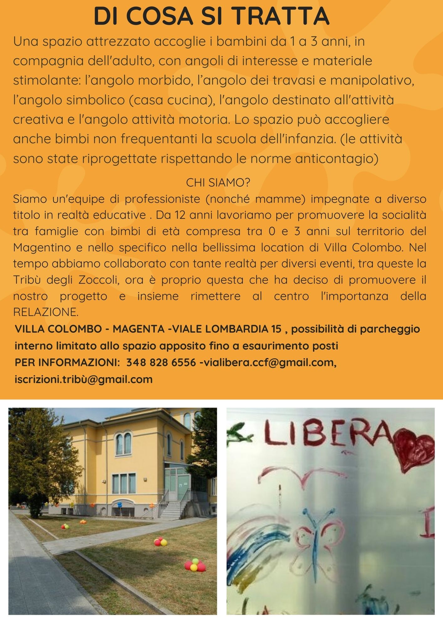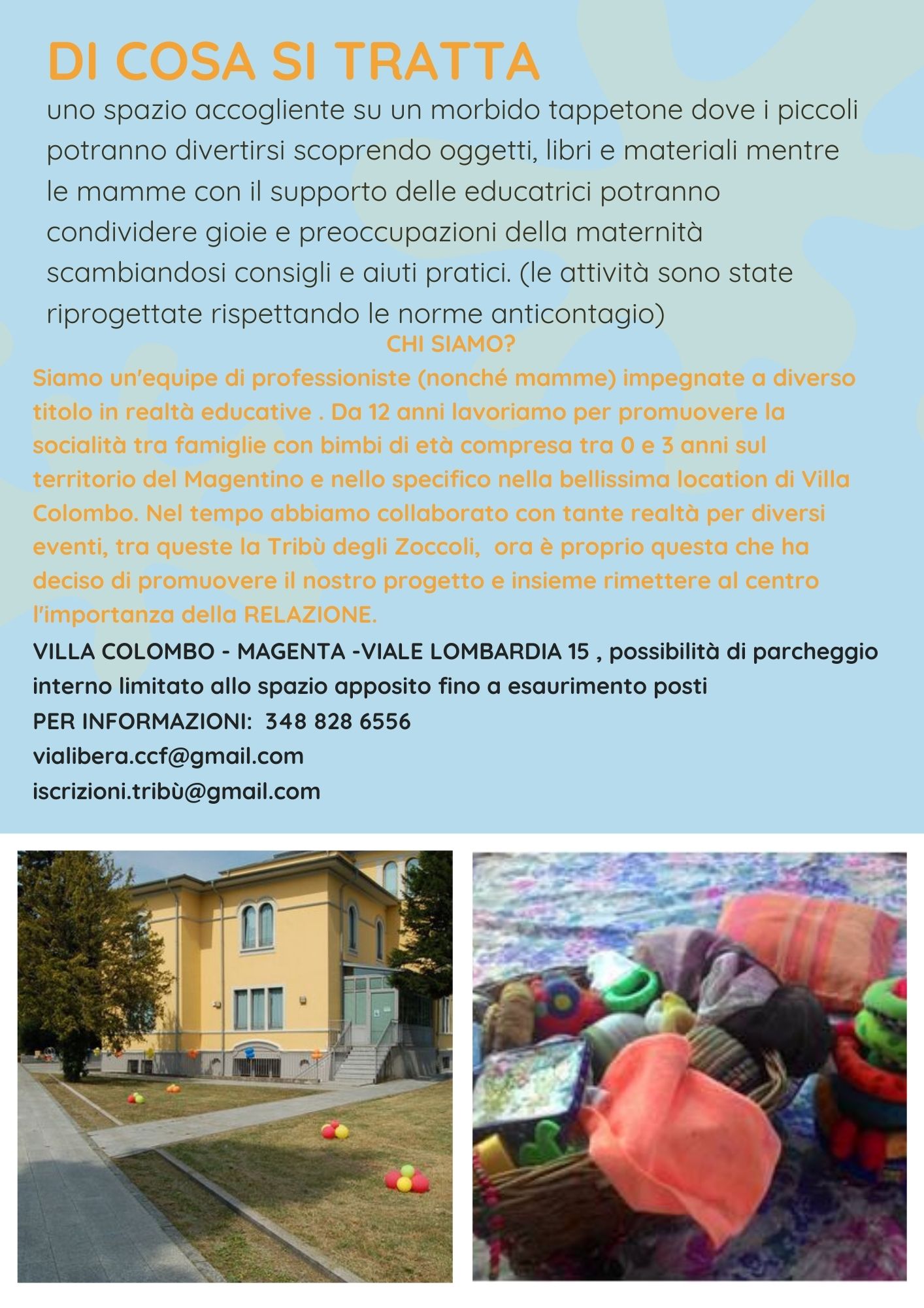 Il progetto ‘ViaLibera, spazi di relazione e legami prossimità’ realizzato in collaborazione dal Comune di Magenta e dall’Associazione La Tribù degli Zoccoli è realtà. Le attività di incontro, gioco e relazione per le famiglie, che si svolgono due venerdì al mese in Villa Colombo, si rivolgono a mamme con bambini fino a un anno di età e alle famiglie con bambini da 1 a 3 anni. Negli spazi organizzati nella storica Villa Colombo i piccoli possono divertirsi e socializzare mentre le mamme, con il supporto delle educatrici, condividono gioie e preoccupazioni della maternità scambiandosi consigli e aiuti pratici.