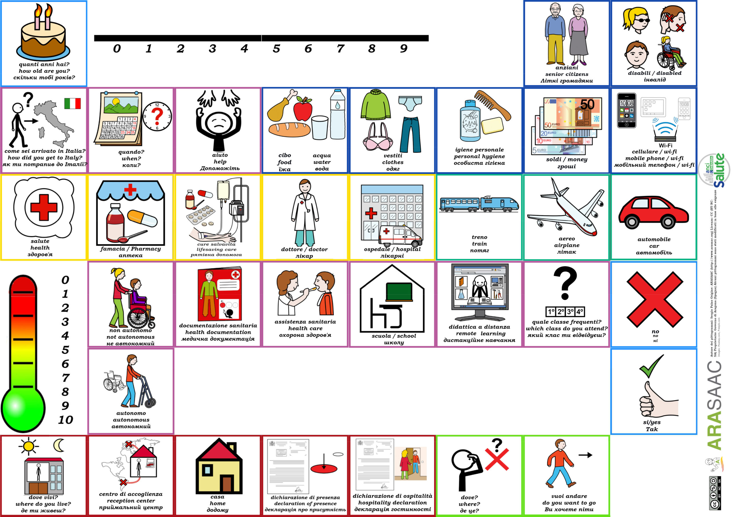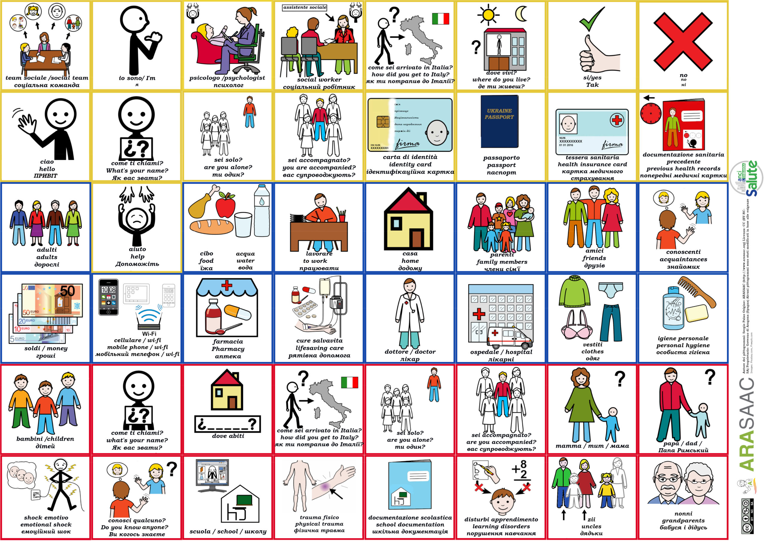 Anci Lombardia Salute ha predisposto alcune tavole in Comunicazione Aumentativa e Alternativa con le scritte in ucraino affiancate ad una immagine grafica che ne esplica il significato, per essere usate a supporto nelle attività di accoglienza. Le tavole pensate inizialmente per l’utilizzo all’interno delle aziende ospedaliere e nei pronto soccorso, riportano pittogrammi che permettono di descrivere diverse situazioni, dalle più semplici come per esempio un mal di testa a situazioni più complesse riguardanti lo stato di salute generale.